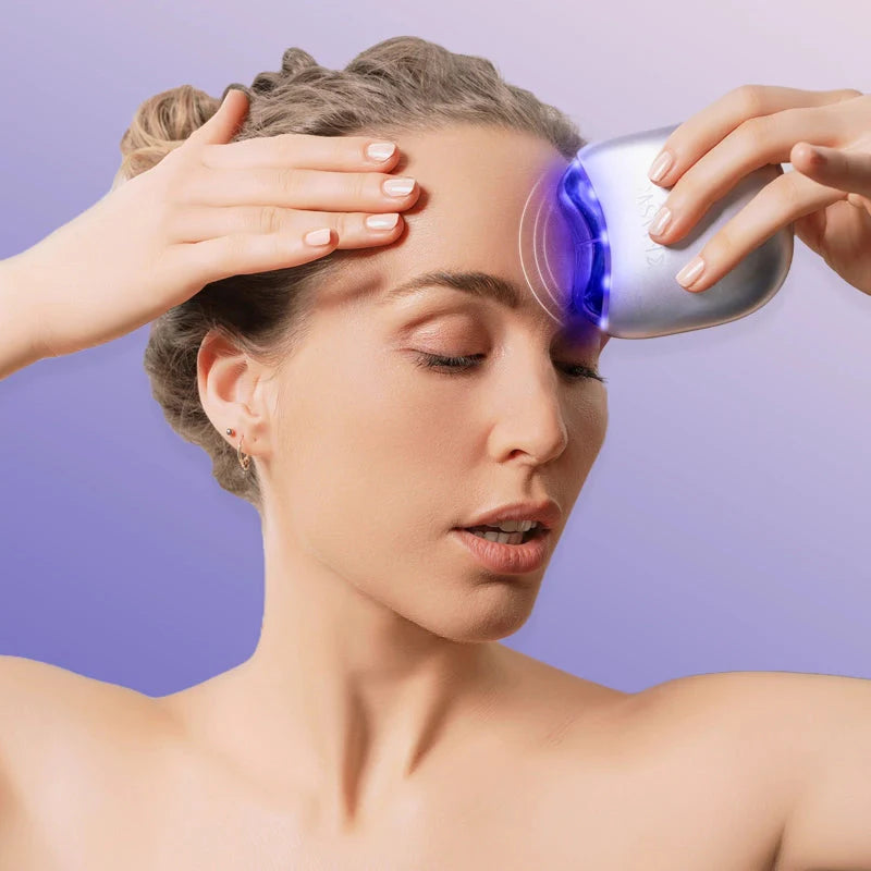 Das EMS Gua Sha Gerät verfügt über drei verschiedene Intensitätsstufen. Beginnen Sie bei der ersten Anwendung im Blaulichtmodus, da dieser die niedrigste EMS-Intensität bietet und Ihrer Haut Zeit gibt, sich an das Gerät zu gewöhnen. Anschließend können Sie das Gerät im Gesicht, am Hals oder am Körper anwenden.